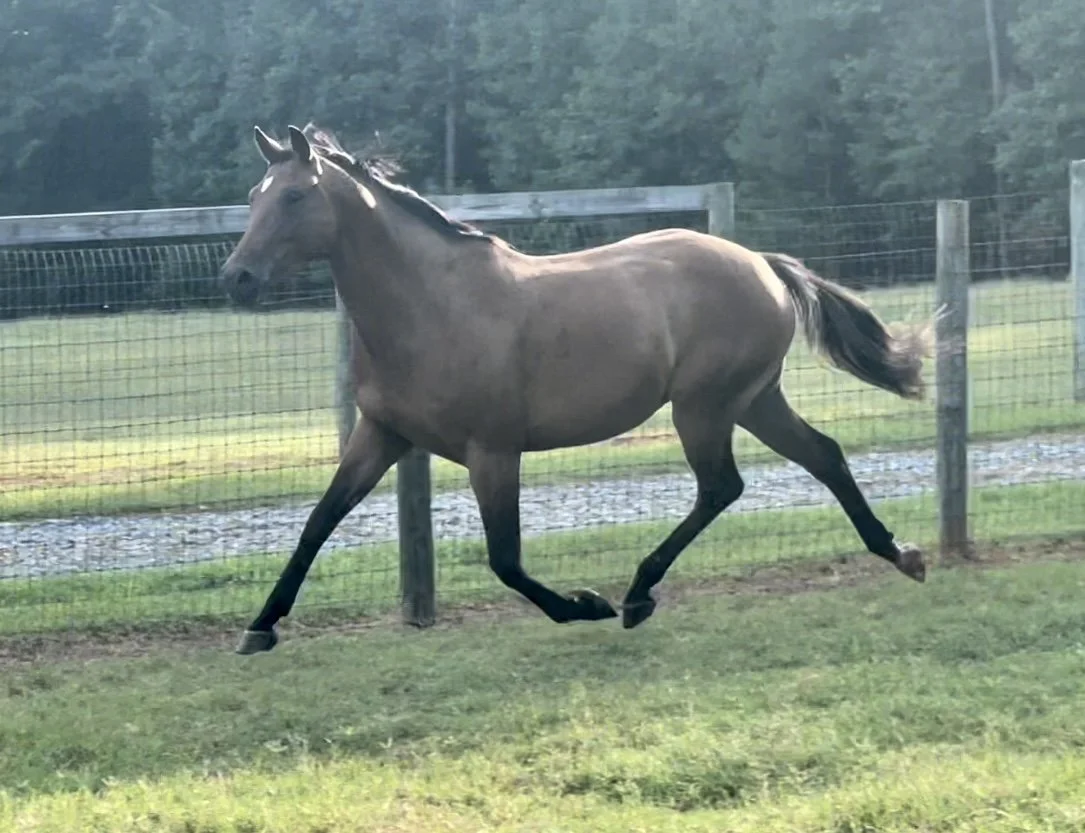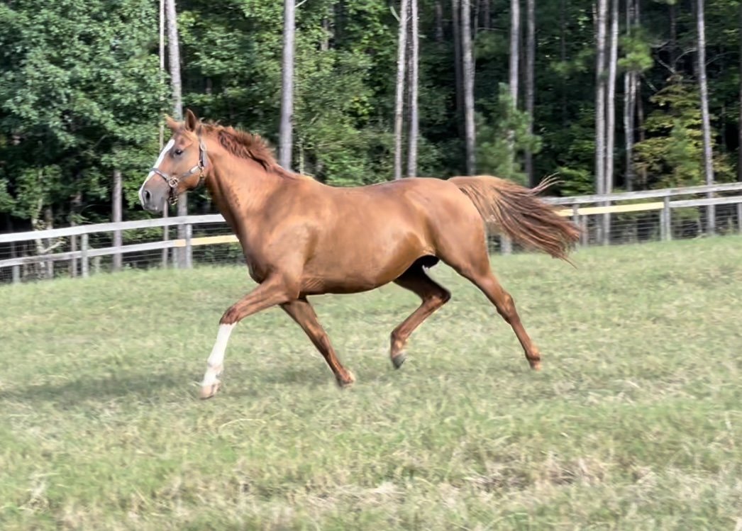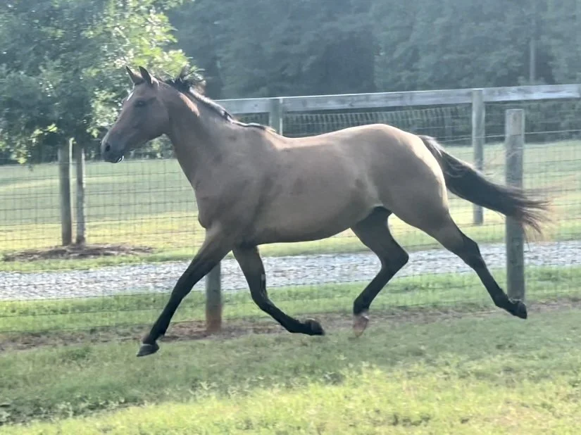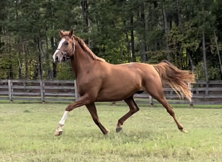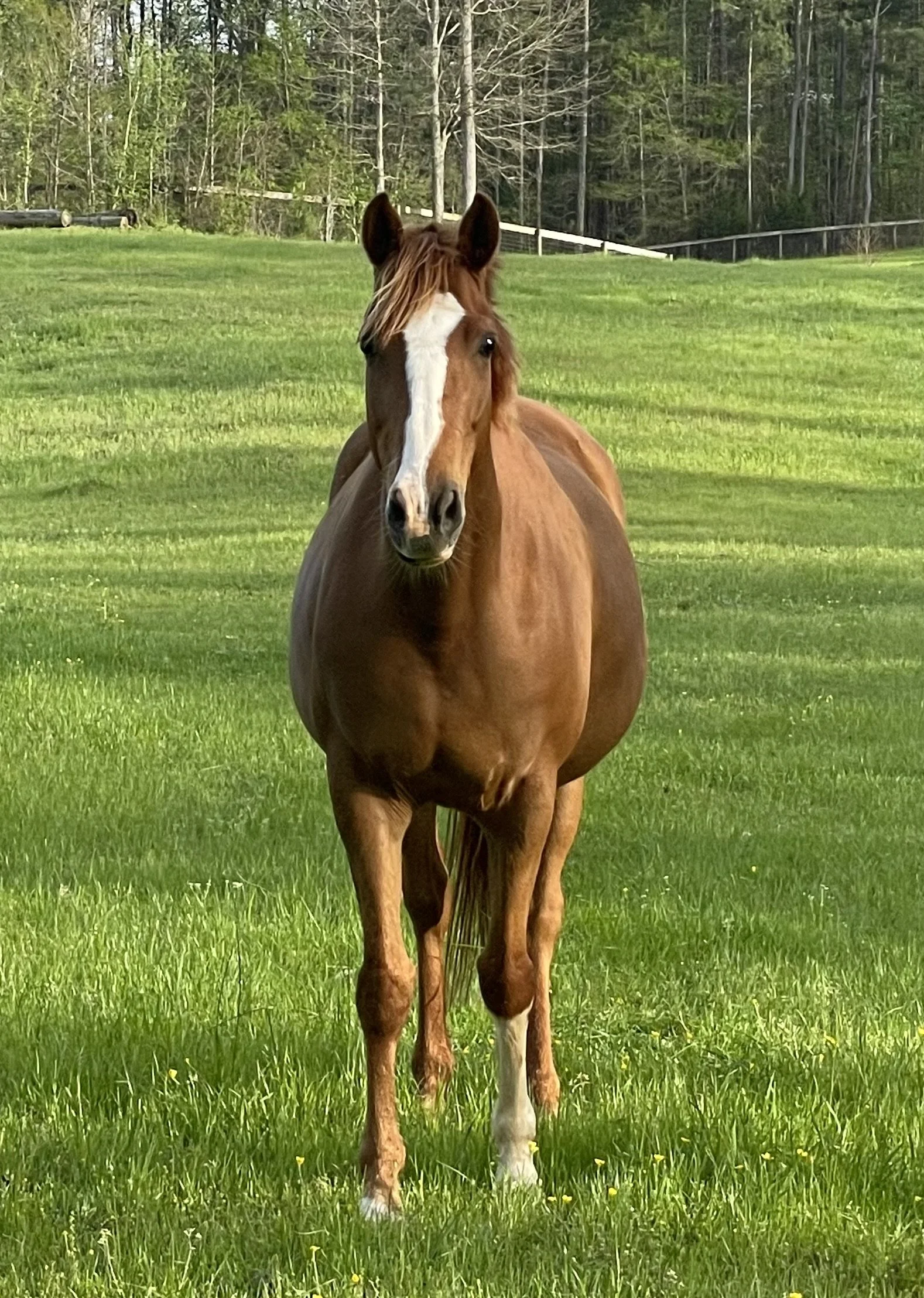'Sprite' is one of the most kind individuals we've ever bred. Sensible beyond her years, she was easy going and quiet from birth. She was sold to an AA as a coming 3 year old as a potential field hunter. Through a series of events and having who knows what done to her, she returned to us in 2022 quite ruined under saddle. She came from an auction barn, underweight, sour and fairly rogue under saddle. We rehabbed her and got her going under saddle again. We did have her jumping and even got her out hunting, but it was evident she was going to have some ongoing mental baggage so we decided (knowing that the brains are in there under the trauma) to breed her to Declan. She did have one foal by him as a 4 year old with her prior owner (he is hunting and eventing successfully) and then she had two while here for us. Both were purchased by the same AA who plans to do dressage and driving with them. Sprite is currently at Swift Level Farm in WV - where *Grange Finn Sparrow lived most of his life in the USA - she has had two foals for them and is turning into an exceptionally nice broodmare.